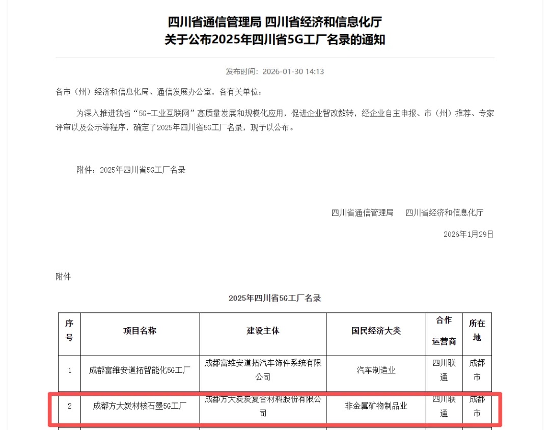 2026年1月30日,成都炭材正式收到四川省通信管理局、四川省經濟和信息化廳聯(lián)合下發(fā)的《關于公布2025年四川省5G工廠名錄的通知》。憑借在“5G+工業(yè)互聯(lián)網”高質量發(fā)展和規(guī)?;瘧?,成都炭材入選該名錄,標志著企業(yè)在數(shù)字化轉型與智能化升級的道路上邁出了堅實的一步。