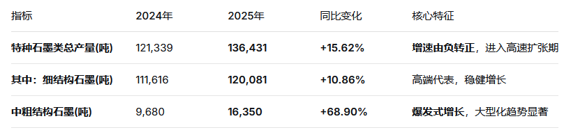 關(guān)鍵洞察:與2024年全品類普跌(-8.8%)形成鮮明對比,2025年特種石墨*反轉(zhuǎn)。特別是中粗結(jié)構(gòu)石墨近70%的驚人增幅,揭示了下游應(yīng)用場景的大型化、規(guī)?;?/strong>突破——這絕非簡單的庫存回補(bǔ),而是產(chǎn)業(yè)需求的實(shí)質(zhì)性躍遷。